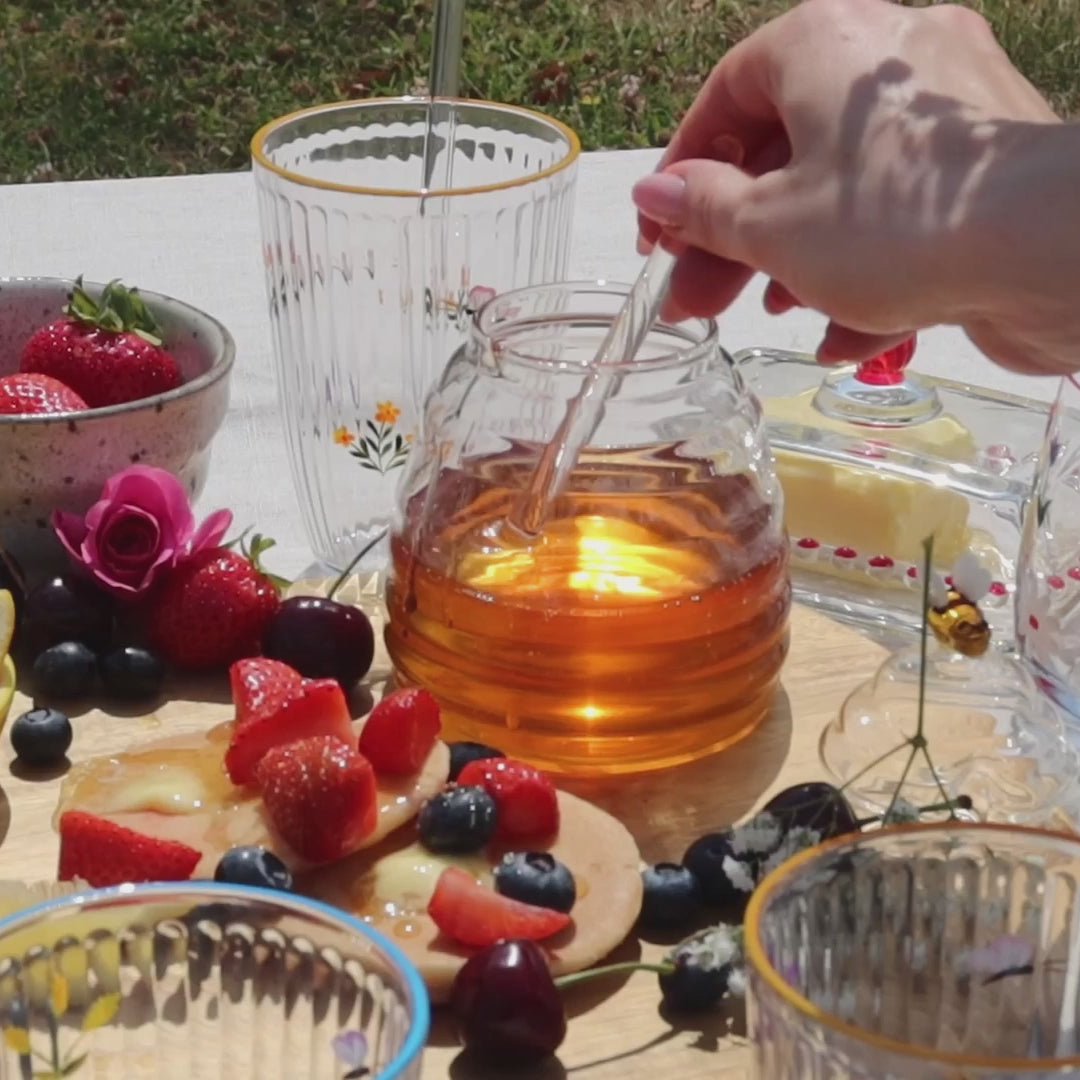 Our adorable bee hive shaped honey Pot and Dipper is the perfect addition to any breakfast table. Crafted from premium borosilicate glass, this elegant 400ml honey jar features a unique beehive silhouette, topped with an intricately detailed coloured glass bee on the lid. The set comes with a matching dipper, perfect for drizzling honey over your favourite recipes.